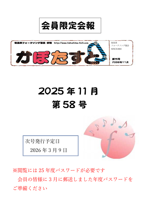 ![]() 【会報かぽたすと第58号.pdf】 会報を閲覧するには、Adobe Acrobat Reader(旧Adobe Reader)および年度パスワードが必要です。Adobe Acrobat